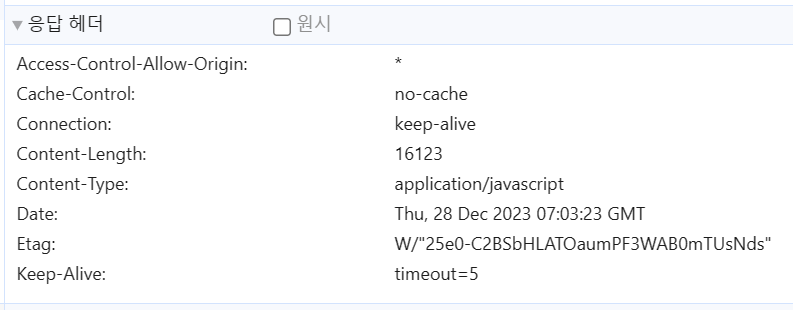위에서 Cache-Control 이 no-cache로 설정되어 있는 것을 확인할 수 있다. no-cache를 설정하면 캐시의 유효 시간이 0초이므로 파일을 가져올 때 마다 서버에 재검증 요청을 보내게 된다.