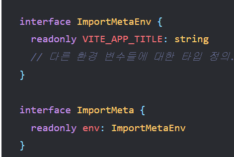 타입스크립트 사용 시 import.meta.env에 대한 타입 정의를 제공하고 있다.