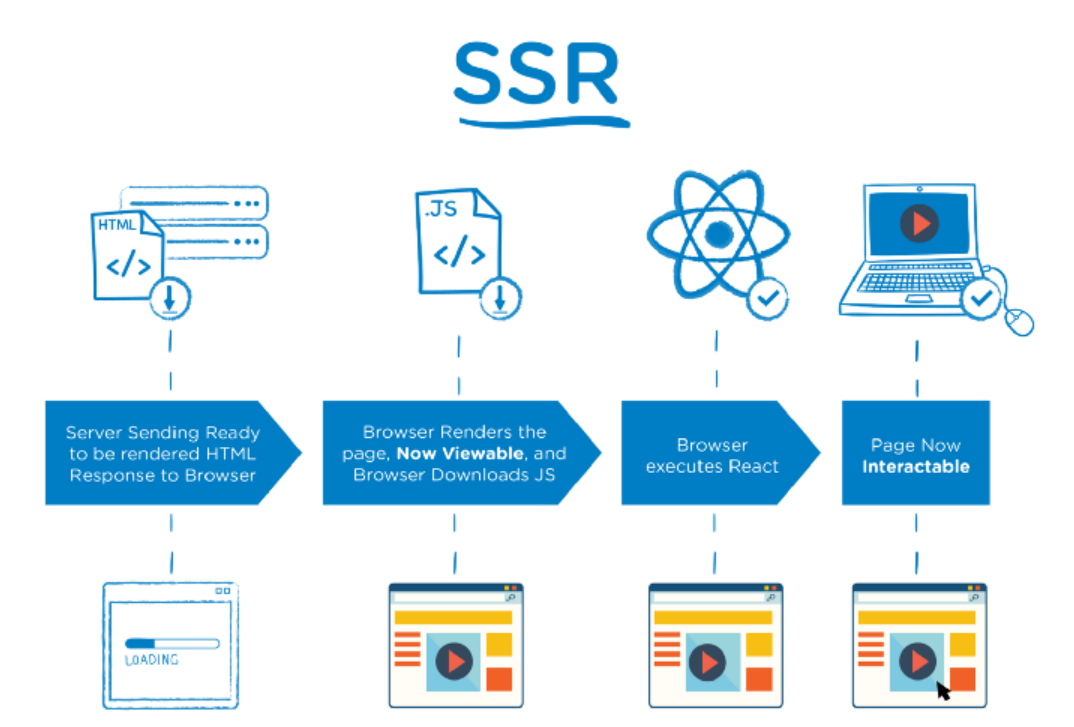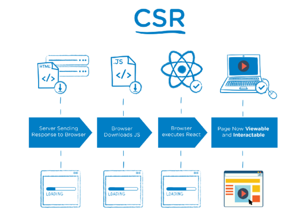 사용자가 페이지에 접속하면 클라이언트(브라우저)가 이를 인지하여 서버에 해당 데이터들(HTML, JS코드 등)을 요청한다. 브라우저가 데이터를 받게 되면 JS파일을 다운로드한 후 페이지를 보여준다. 모든 HTML 내용과 JS파일을 받아온 후 다운로드하여 보여지게 되므로 당연히 초기 페이지 렌더링 속도가 느릴 수 밖에 없다.