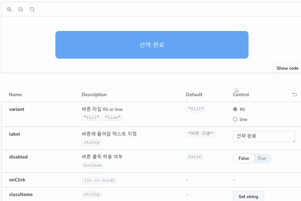 variant 속성은 'fill' 과 'line' 으로 구분되며, disabled 는 boolean 타입을 가지고있다.