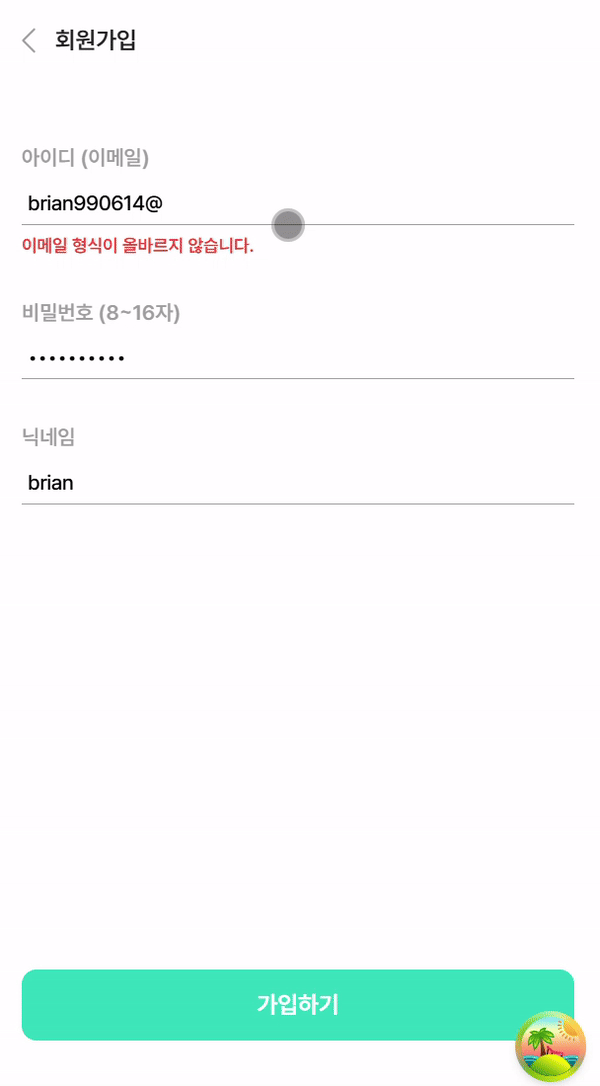 위와 같이 조건을 만족하지 못한 채 가입하기 버튼을 누르면 비밀번호 input 아래에 에러 메시지가 나타나게 된다.
