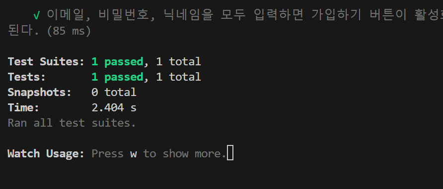 그러면 가입하기 버튼이 활성화되어야 하므로 expect & toBeEnabled의 조합으로 해당 버튼이 활성화 되는지 체크하였다.