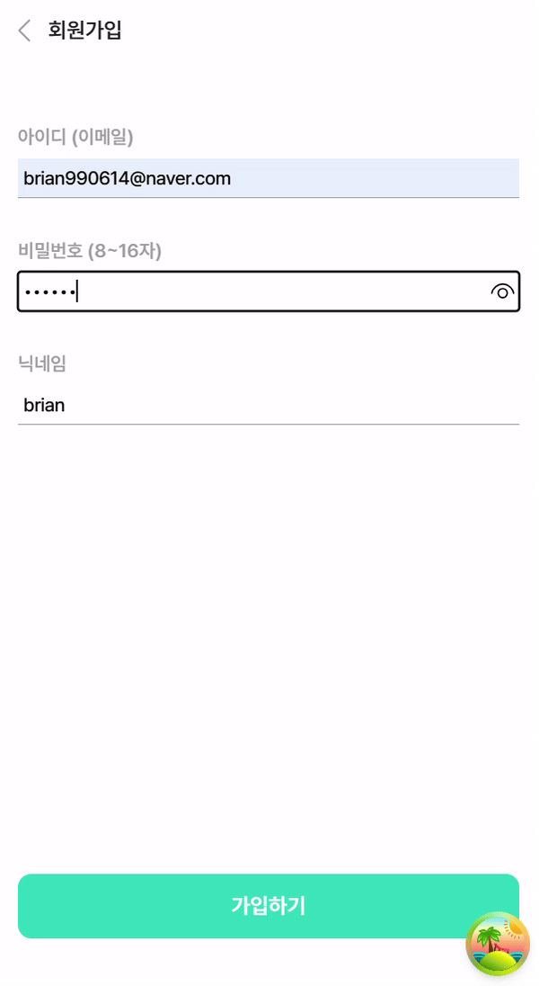 Test 1: 이메일, 비밀번호, 닉네임을 모두 입력하면 가입하기 버튼이 활성화된다.