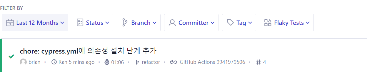 그러면 Cypress Cloud에서 해당 브렌치에서의 테스트 결과를 자동으로 확인할 수 있는 것이다.