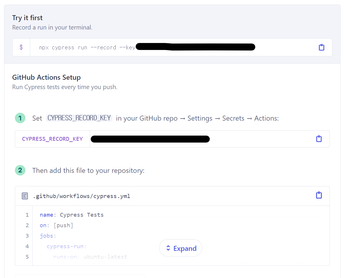 우선 매뉴얼대로 CYPRESS_RECORD_KEY 를 Github의 secret(New Repository Secret)에 넣어주었다.