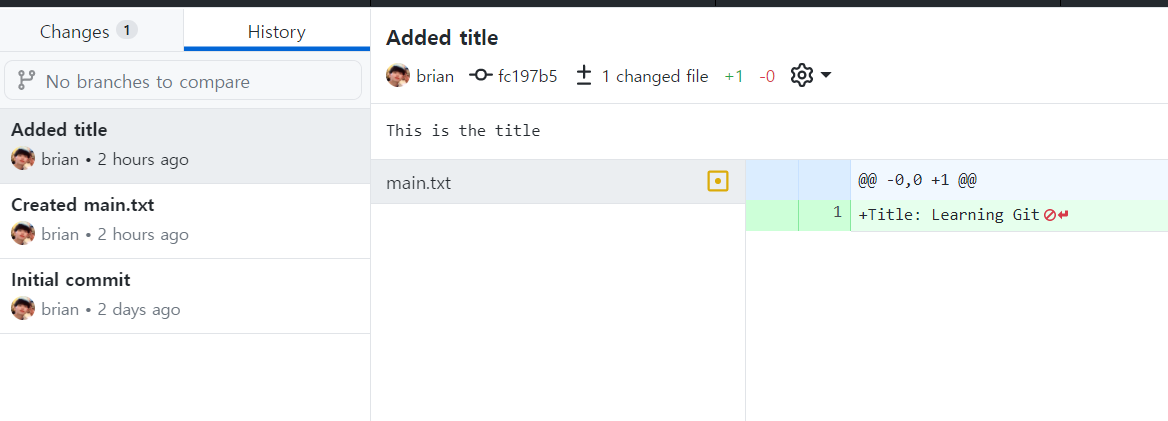 위와 같이 처음에 자동으로 있었던 .gitattributes 가 Initial commit와 같이 방금 진행한 Commit이 기록되어 있는 것을 확인할 수 있다!!