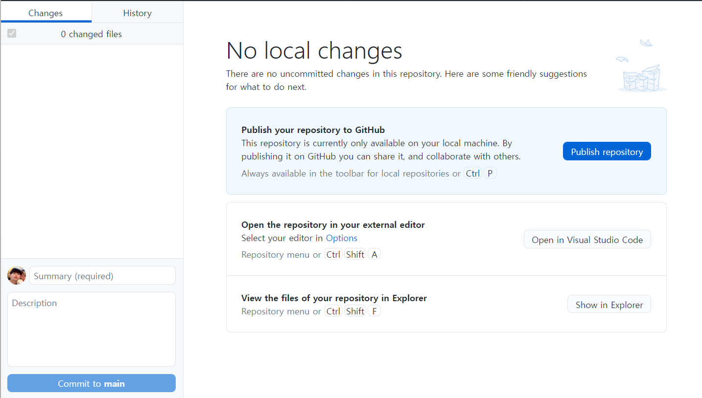 -> Staging Area : 변경사항이 있는 파일들을 지정하여 commit 할 것인지 정할 수 있는 공간(default로 Github Desktop은 모든 수정사항들은 Staging Area에 추가됨!)