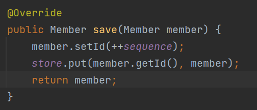 Member 클래스에 있는 setId 메소드를 이용하여 member 객체의 id에 현재 sequence값+1 을 저장해주고, store.put을 이용하여 store에 id 값과 member 객체를 저장해준다.