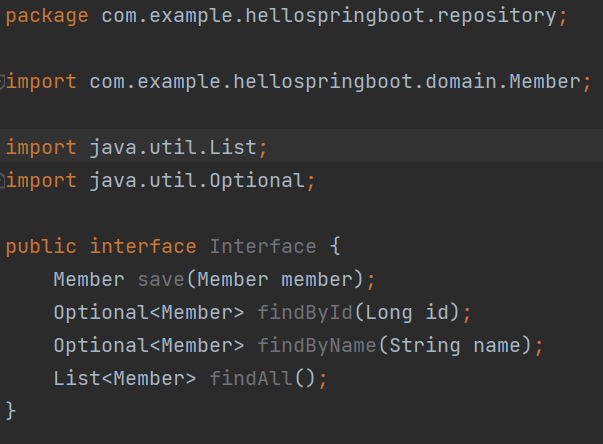 그리고 main -> java -> com.example.hellospringboot 에 가서 repository라는 package를 하나 만들어준 뒤, 여기에 MemberRepository라는 Interface를 하나 만들어준다.