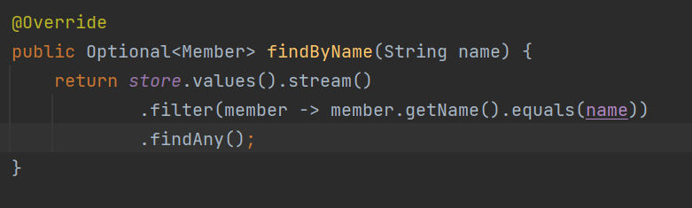 store.values().stream() 을 통해 store에 저장되어있는 member객체들을 모두 돌며 filter()를 통해 찾는 name과 같은 name을 가진 객체를 찾은 후, findAny()를 통해 그 중 하나를 return 해준다.