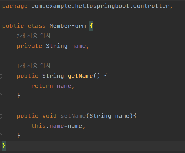이제 main -> java -> com.example.hello.springboot -> controller 에 가서 MemberForm 이라는 Class를 하나 만들어준 뒤